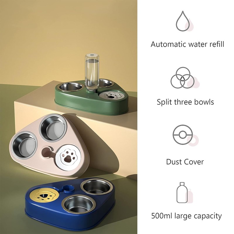 - High Quality The bowl made of high quality stainless steel is easy to clean, just rinse or wipe clean. The high-quality plastic bottle and water bowl are safe and environmentally friendly. The 3 in 1 feeding bowl design includes an automatic water dispenser