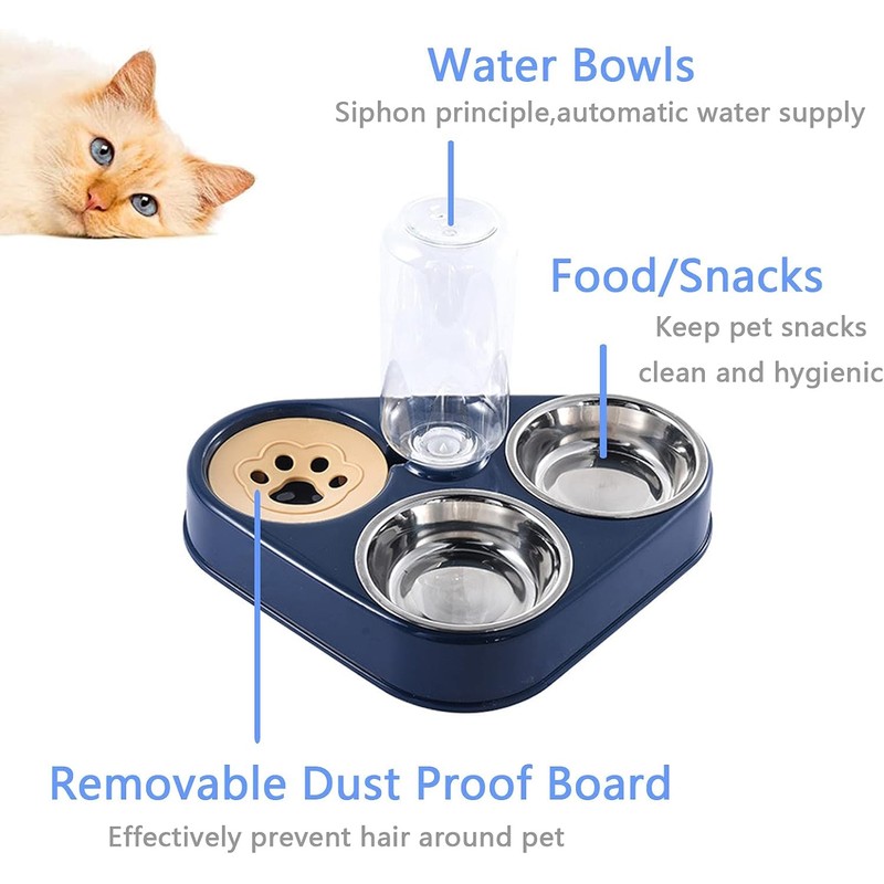 Cat Feeding Bowl, Stainless Steel Feeding Bowl, 3-in-1 Cat Feeding Bowl with Automatic Water Dispenser, Double Feeding Bowl for Small and Medium Cats and Dogs (Blue)