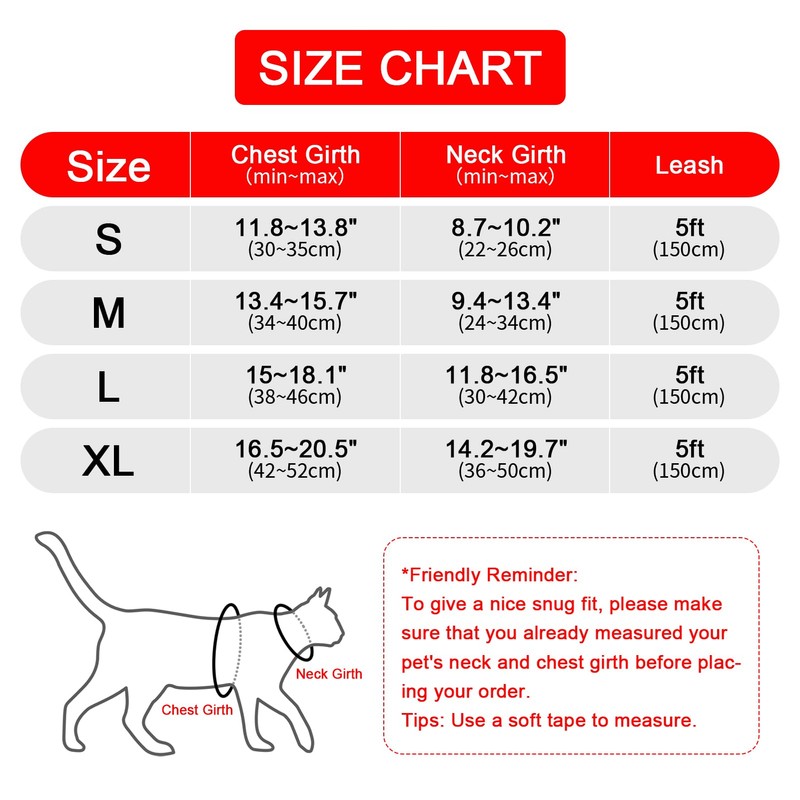 - PACKAGE INCLUDES 1 x Medium dog harness and 1 x 59 inch nylon leash; To ensure this harness fits your pet, please refer to the size chart for your pet to measure your pet before ordering. We recommend that you use a tape measure to get more accurate data. Since cats are very sensitive, your pet may safe to wear the harness at the beginning. You can distract the cat from the harness