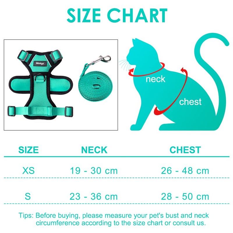 - Ideal for most cats: The cat harness with lead is available in three sizes, XXS (neck: 15-22 cm; chest: 24-38 cm), XS (neck: 19-30 cm, chest: 26-48 cm), S (neck: 23-36 cm, chest 28-50 cm). Please measure the neck circumference close to the fur and add 2-3 cm to increase comfort. If you are undecided between two sizes, it is best to choose the smaller one. PACKAGE INCLUDES 1 x Cat Harness and 1 x Nylon Leash (150cm).