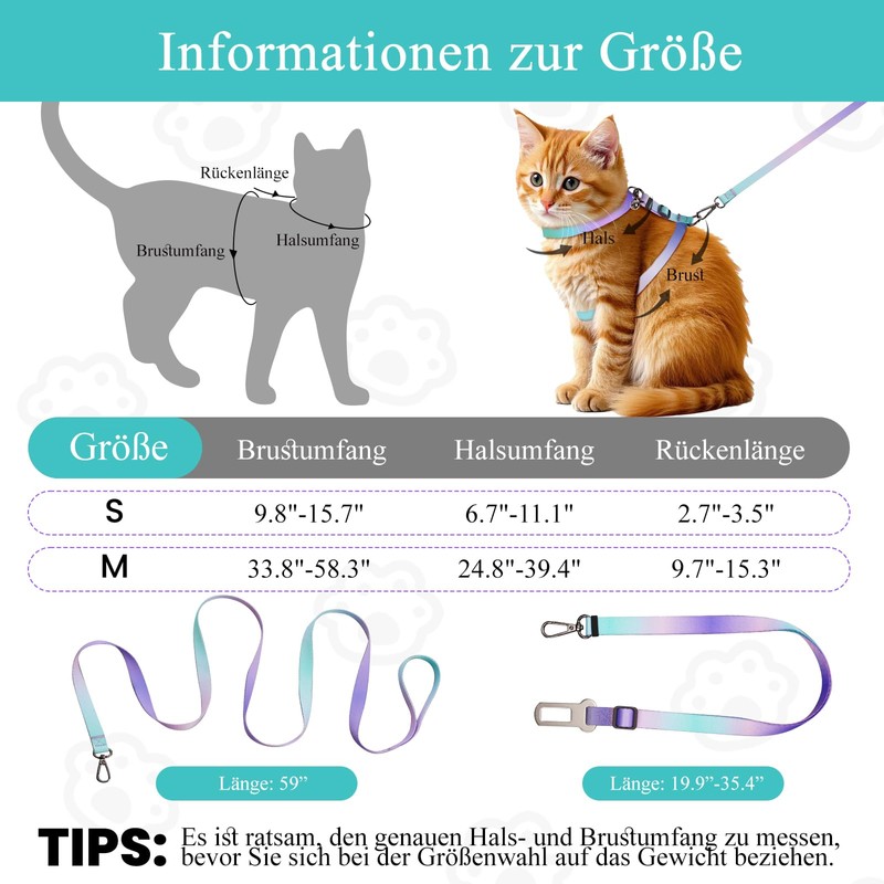 - Suitable for most cats: To meet cats of different ages and weights, this cat harness has adjustable buckles on the neck and chest, which increase flexibility by 200%. The versatile design is suitable for both small and large cats, and the stylish gradient design adds unique charm that makes your pet stand out in any crowd. Before purchasing, you should accurately measure your cat's neck circumference, chest circumference and weight to ensure a precise fit. (Note: if your cat is wearing a harness for the first time, you can train them with treats for a week.)