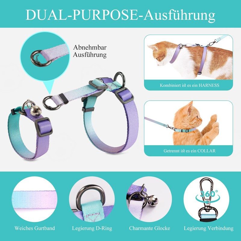 - ▶【4-in-1 set】Do you want a collar, harness, pull cord or seat belt for driving for your cat? How about all fours! Our team has developed a completely novel design that solves all problems completely. With a removable round metal ring, it converts from a simple collar to a practical harness and seat belt - giving it a variety of options to make it easier for your cat to get used to wearing it. Perfect for walking, travel, training and car trips.