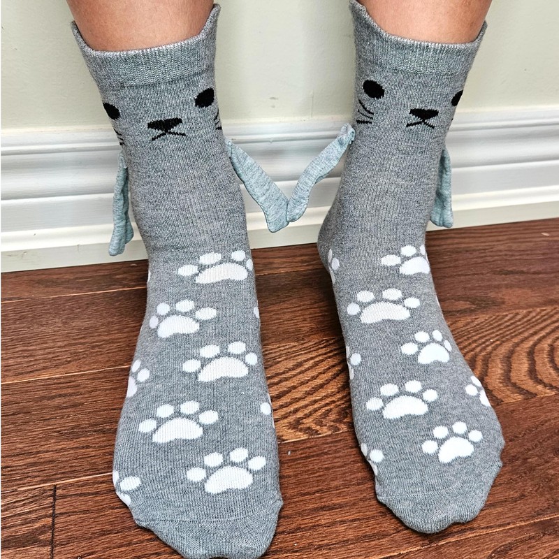- Cat holding hands socks come with a magnetic hand design that adds a playful touch to your every step. Whether you're out for a walk, waiting in a queue, or simply sitting comfy on the sofa, this magnetic feature is a fun addition. The tiny paws on the funny socks come together, creating a hand-holding effect that's bound to bring joy to your day. Ideal for outdoor adventures or cozy evenings at home, these magnetic socks that hold hands sprinkle a bit of fun onto every moment.