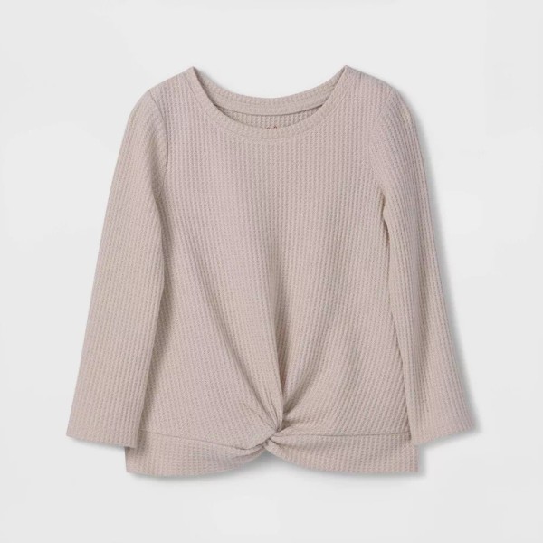 This Solid Cozy Waffle Long-Sleeve Top from Cat and Jack? will keep your little one looking snug and sweet during any occasion. With a waffle-knit pattern all over, the solid-hued T-shirt sports a charming twist-front accent at the hem that adds a cute look while keeping them cozy. This crewneck shirt is crafted from a soft fabric blend with a touch of spandex, and has a regular fit that hits below the waist to keep your toddler at ease whether they're at home or out and about. Have them wear it with jeans, leggings, capris, joggers or shorts and sneakers or flats. Cat and Jack?: Classics with an imagination of their own. Size: 3T. Color: Cream. Gender: female. Material: Rayon.