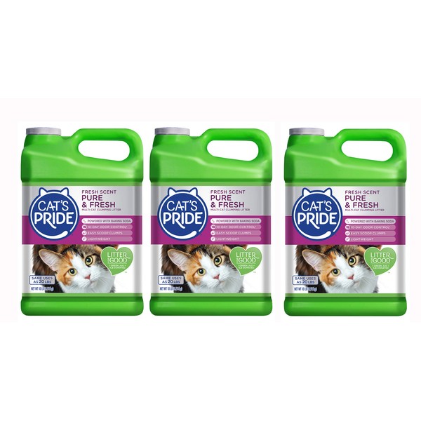 Cat's Pride Fresh Scent Pure & Fresh Multi-Cat Clumping Litter provides ten day odor control because a fresh home is a happy home. And with the proprietary odor control technology of our scented multi-cat formula, both you and kitty are sure to enjoy a fresh litter box for ten days. Easy scoop clumps, we know how to keep it together. Fresh Scent Pure & Fresh immediately forms extra hard clumps that are a breeze to scoop and dispose. Our 99 percent dust free formula eliminates dust clouds and mess around your kitty's box during use and litter changes, minimizing cleanup. Up to 50 percent lighter, why lug around heavy litter? Fresh Scent Pure & Fresh delivers powerful performance in a lightweight package. For 75 years, Oil Dry, makers of Cat's Pride has been the expert in liquid absorption. Our clay products are used all over the world for edible oil purification, jet fuel filtration, keeping major league baseball fields dry, and raising healthy crops and livestock. This expertise has been used in developing our breakthrough Cat's Pride Fresh Scent Pure & Fresh products. We're passionate about developing innovative products to keep cats and their owners happy. Formulated for multiple cats. Fresh, clean scent. Sold as a case containing three 10-pound jugs of litter.