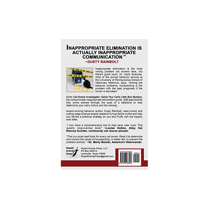 Inappropriate elimination is actually inappropriate communication. ~ Dusty RainboltInappropriate elimination is the most vexing problem cat owners face, but there's good news. Dr. Carlo Siracusa, chief of the animal behavior service at the University of Pennsylvania School of Veterinary Medicine, says, "Among behavior problems, housesoiling is the problem with the best prognosis if the owner is educated." Enter Cat Scene Investigator: Solve Your Cat's Litter Box Mystery, the consummate inappropriate elimination guide. CSI approaches kitty crime scenes through the eyes of a detective to help determine your cat's motive and the remedy.Award-winning behavior author Dusty Rainbolt uses humor and cutting-edge science-based research to bust feline myths and help you devise a practical strategy so you and Fluffy can live happily ever after.This comprehensive handbook includes: Veterinary and behavioral breakthroughs that will help you understand your cat's litter box needs Setting up a litter box your cat will want to pee in Insight into illnesses that can cause or contribute to litter box mishaps Finding the culprit in a multipet home Determining whether your cat is peeing or marking The effects of stress or fear on feline litter box behavior How to stop urine marking Tips from people who have successfully been-there, done-that Techniques to remove odor from soiled flooring"I now have a comprehensive tool help to save cats' lives: This superb, long-overdue book!" ~ Louise Holton, Alley Cat Rescue founder, community cat rescue pioneer"This is a must-read book for every cat owner. Read it to determine and correct the cause of housesoiling, or better still, to prevent the problem entirely." ~ Dr. Marty Becker, America's Veterinarian"When good cats go rogue on elimination, cat care and behavior author Dusty Rainbolt can not only herd cats, but can round up a full litter-box of information. Awesomely organized, Cat Scene Investigator's clever concept and its author's thorough knowledge, clarity, and humor of presentation makes the many practical and creative options on what to do a catwalk for the reader." ~Carole Nelson Douglas, author of the Midnight Louie feline PI mysteries and cat rescuer