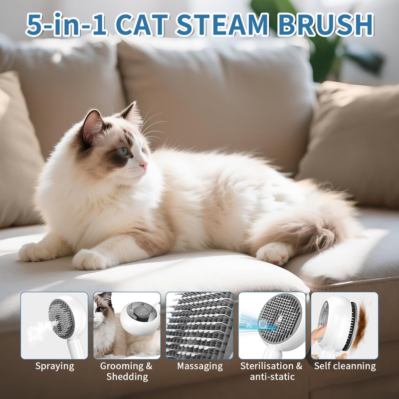 - 【5-in-1 Upgraded Cat Steam Brush】2025 Innovative multi-functional cat brush including grooming, massaging, self-cleaning, shedding, spraying and sterilizing these major functions. Compared with traditional pet brush, the spray holes are centrally located to pre-moisten the skin evenly; the gentle spray can soothe pets that are afraid of water; reduce static electricity and flying hair; soften pet hair, remove loose pet hair; reduce tangles and matting, remove dirt and grease, make the coat shiny and provide quality care for pets.