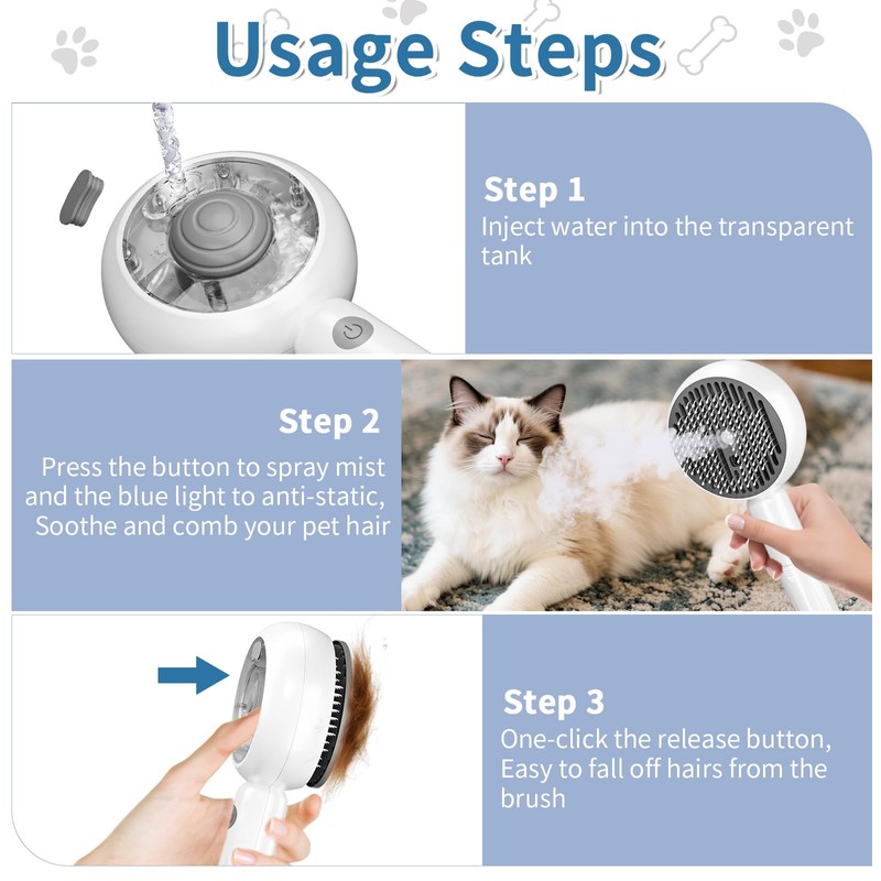 - 【Easy Desheding】The cat steam brush is designed with a transparent water tank that you can observe the water balance and add at any time. Scientific blue light irradiation can effectively sterilise the pets skin. Ensures a gentle grooming experience for your pets.