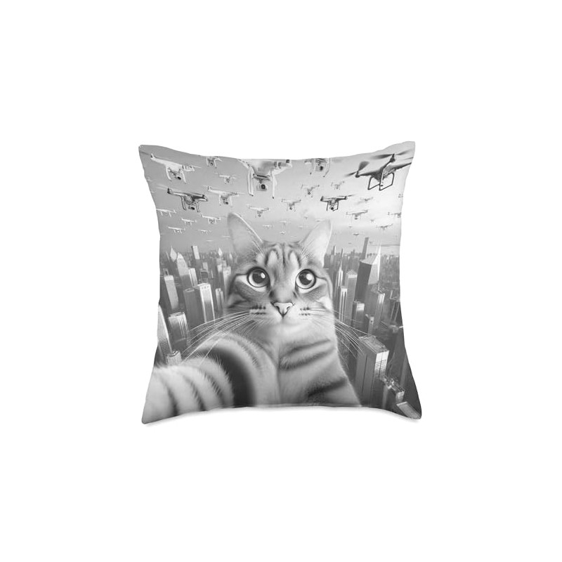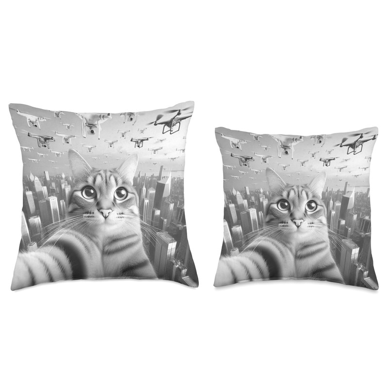 Cat Taking a Selfie With Drones Funny City Kitty UFO Throw Pillow