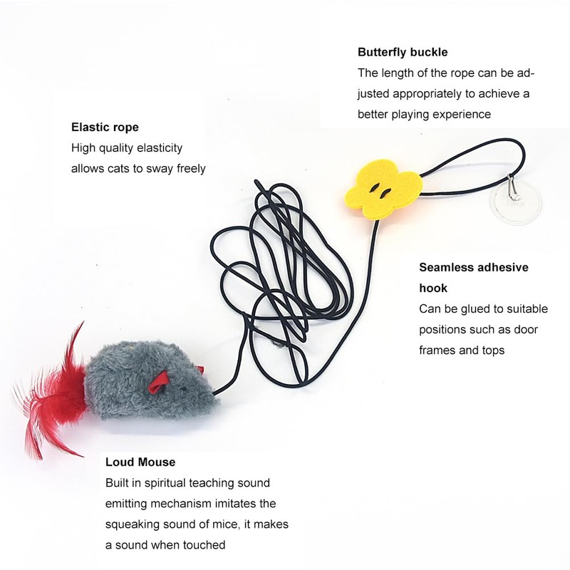 • ADJUSTABLE BUNGEE ROPE The bungee rope can be adjusted to the desired height, allowing mice to be pulled away from cats without getting caught easily. When the cat accesses and releases, the mouse flies back and forth and emits a squeaky sound that brings unpredictable and tense elements into play