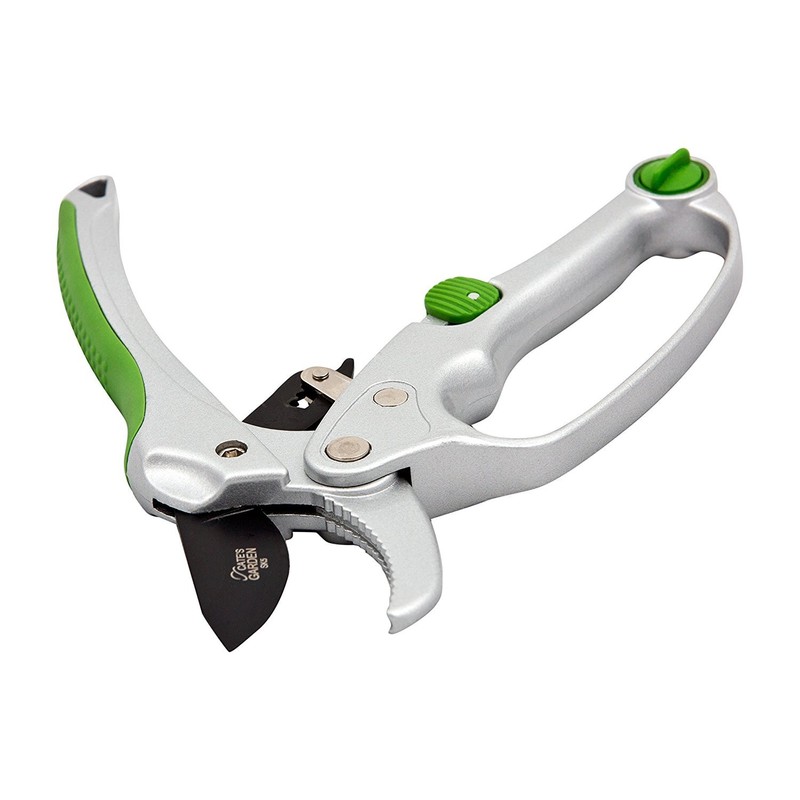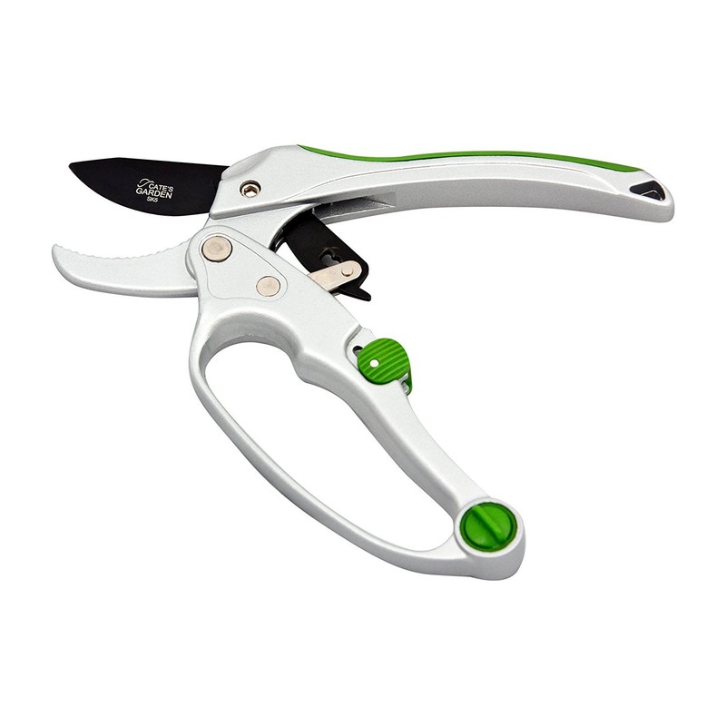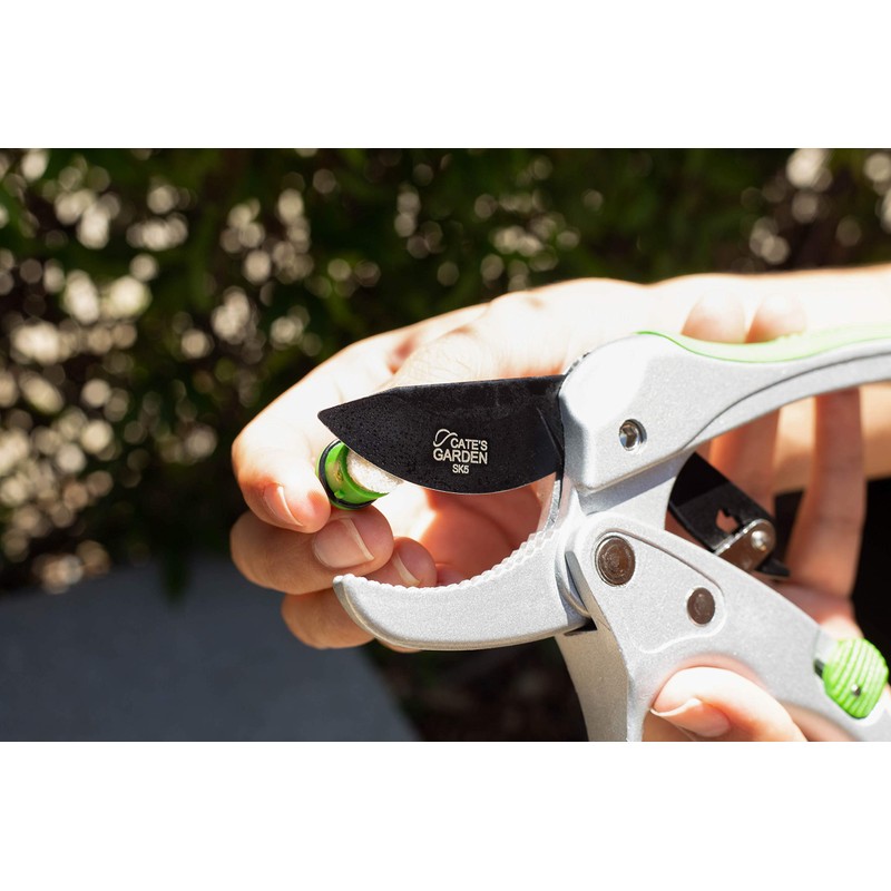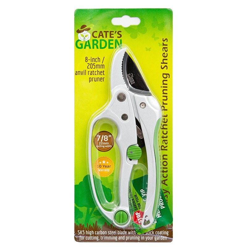 Cate's Garden - Tijeras de poda de carraca de 8 pulgadas de fácil acción, diseñadas para recortar sin esfuerzo setos y ramas de árbol, cuchillas SK5 de alto carbono resistentes para una durabilidad duradera