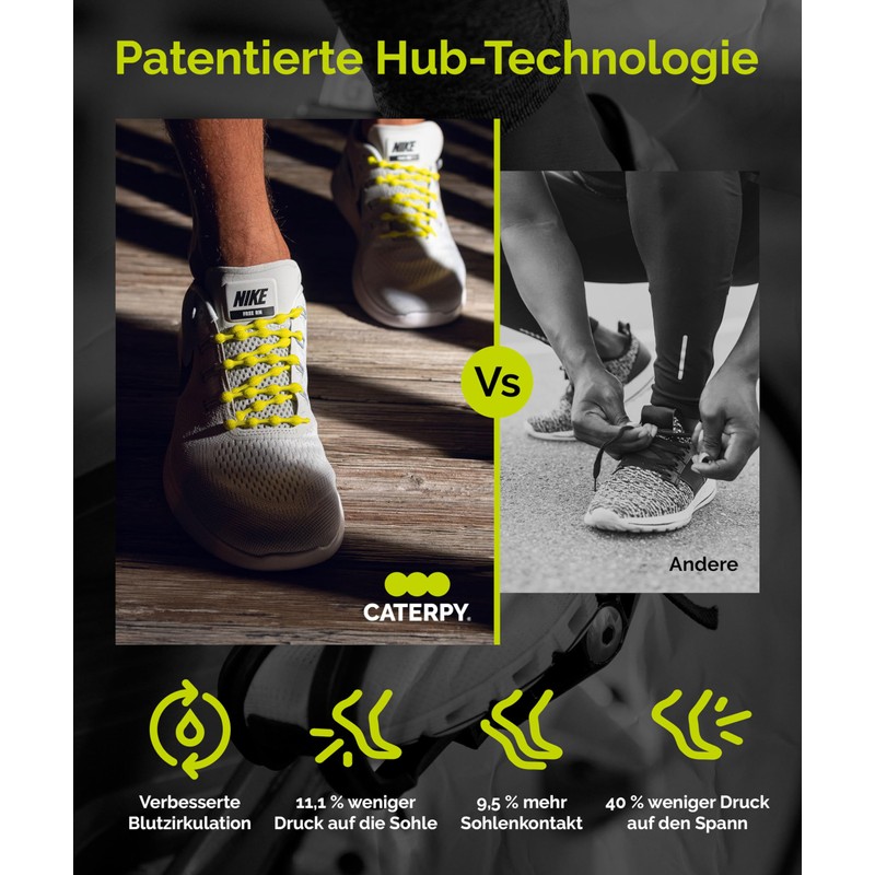 - FEEL THE DIFFERENCE - Once you have tried a pair of Caterpy and felt the difference, you will never want to return to traditional shoelaces. Caterpy laces are guaranteed to last at least one pair of trainers.