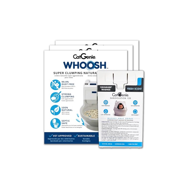 - PACKAGE CONTENTS: Includes three 4.92 lb bags of Unscented cat litter (14.8 lbs total) and one Fresh Scent SaniSolution Cartridge for complete litter box maintenance of the CatGenie Whoosh