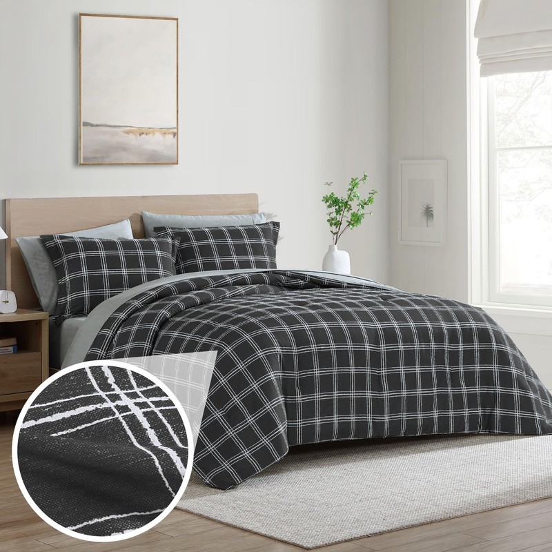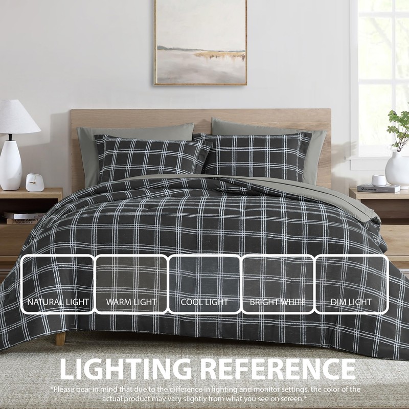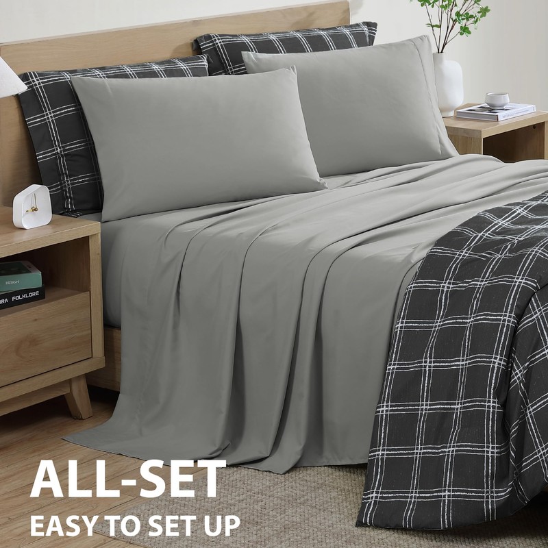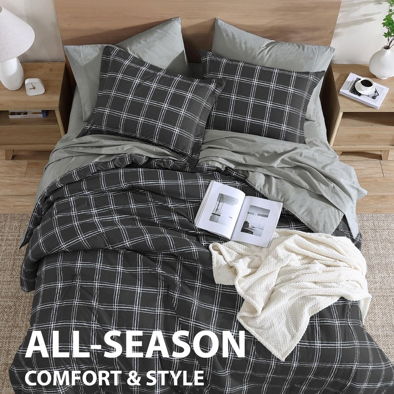 Cathay Home Basic Bedding Home Essential Ultra Soft Lightweight 7PC Wrinkle Resistant Microfiber Bed in a Bag Set (Includes Complete Sheet Set & Comforter Set) - Black Plaid, Queen