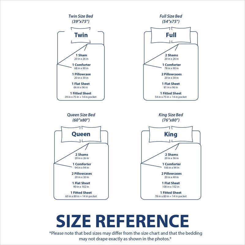 - WHAT’S INCLUDED - Queen Set: One Comforter (86"x86"), Two Standard Shams (20"x26"+2" flange), One Fitted Sheet (60"x80"+14" pocket), One Flat Sheet (90"x102") and Two Pillowcases (20"x30")