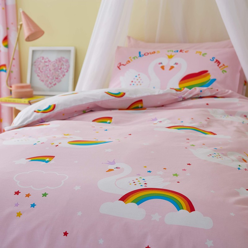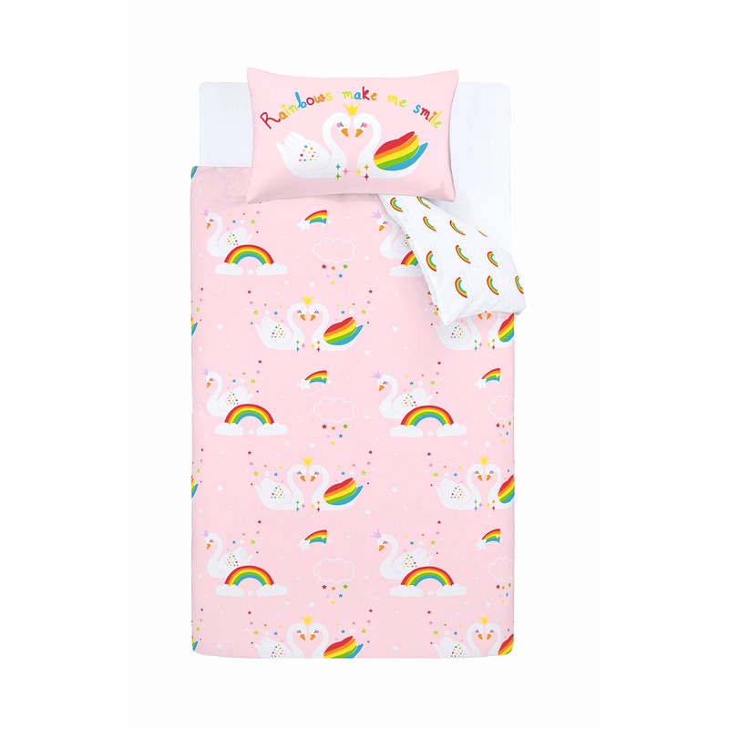 - Pretty pink bedding with rainbows and magical swans and a cute mini rainbow reverse is just perfect to make you smile