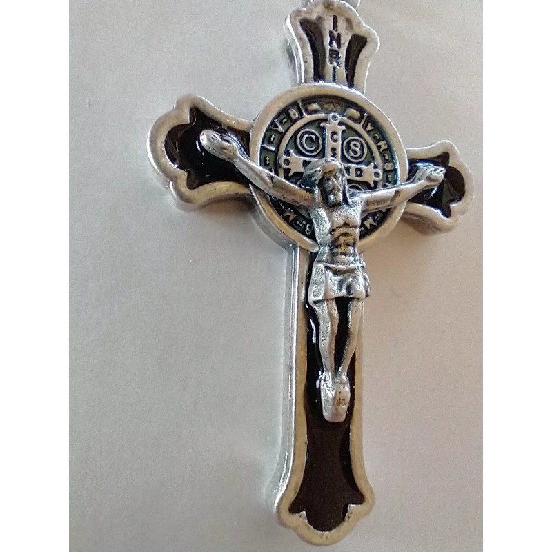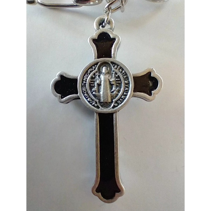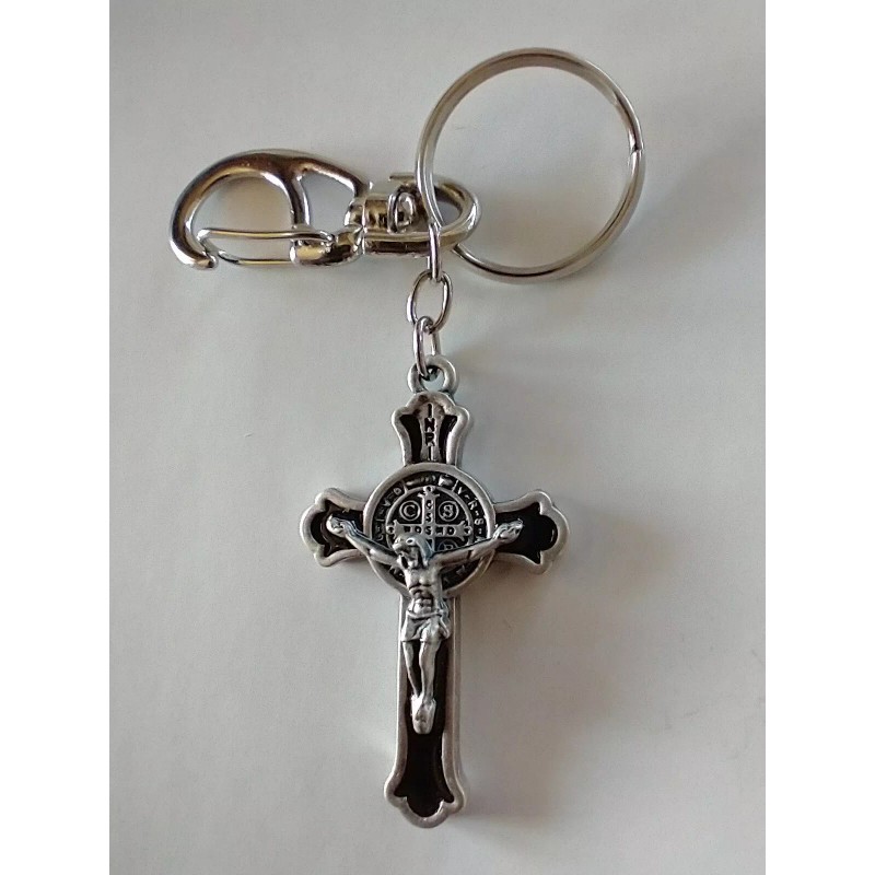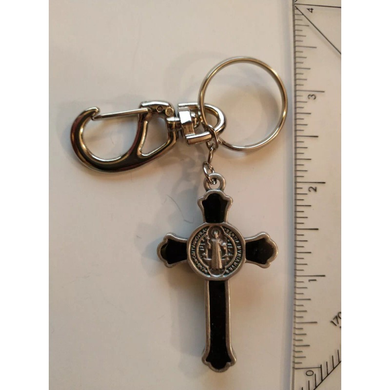 Catholic St Benedict Black Enamel Crucifix Medal Keychain Silver Tone Key Chain