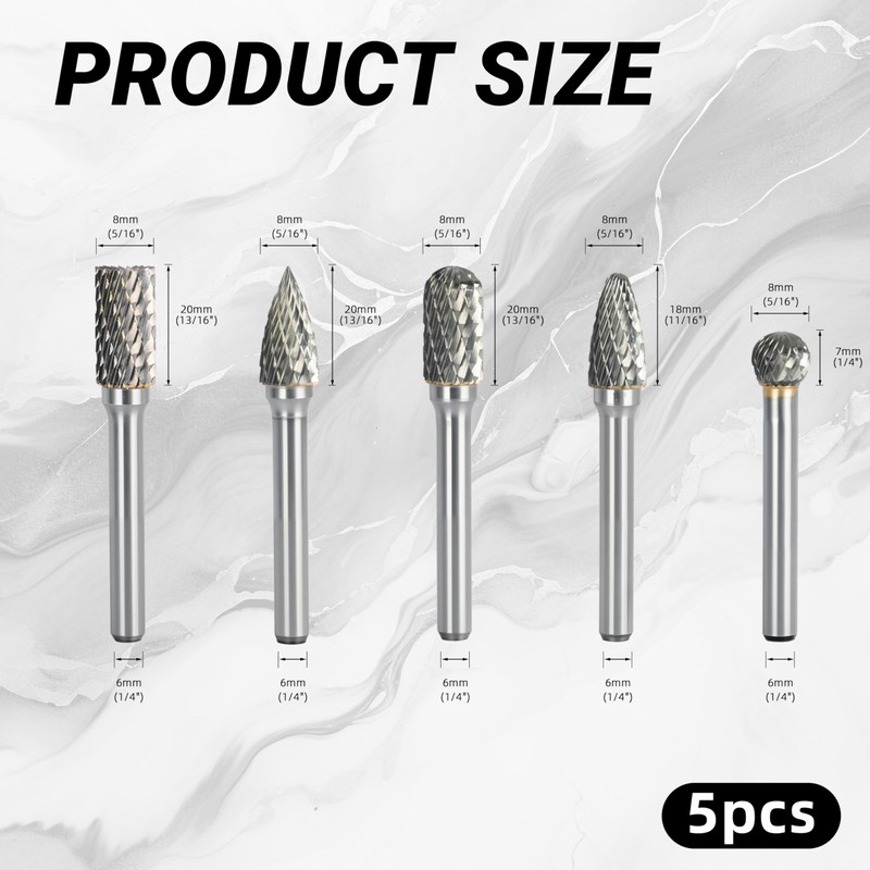 - 【Multi Functional Set】 Complete 5-piece carbide burr set with 1/4 inch shank and 8mm head diameter for various grindingdebuming,and carving applications