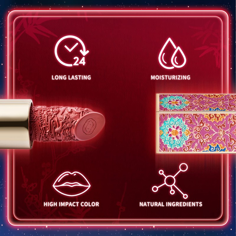 - 【Relief Sculpture Crafts】 The outer case of this lipstick is inspired by Chinese Traditional Paintings, inheriting the eastern culture. The outer case of this lipstick is inspired by Chinese Traditional Paintings, inheriting the eastern culture. And the lipstick paste is carved by miniature and relief sculpture crafts and to promote the aesthetics of the Chinese intangible cultural heritage to the world.