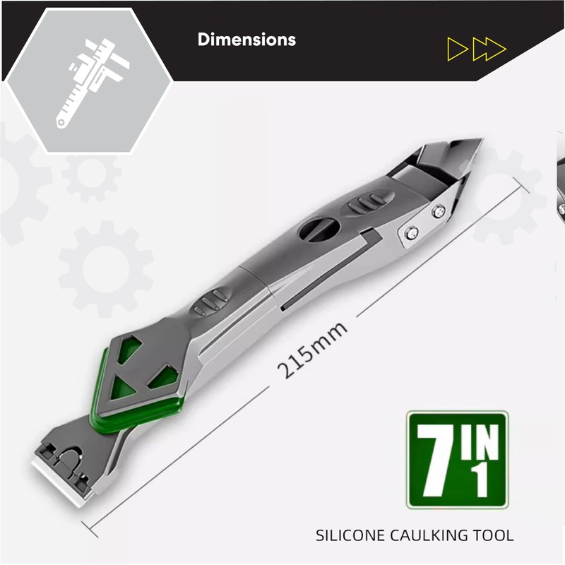 Caulking Silicone Smother Remover Tool, 7-in-1 kit Scraper, Silicone Smoother, Rubber Shovel, 5 Pads, Sickle, 4 Blades. Stainless Steel Nozzle applicator, Tile Grout Removal Set I Green
