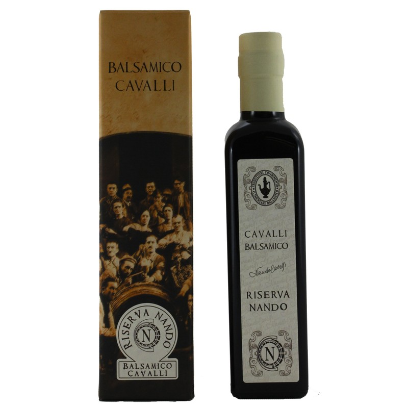 Cavalli Riserva Nando Balsamic Seasoning is a condiment with a finer, more intense flavor resulting from longer aging in small casks. Cavalli Riserva Nando Balsamic Seasoning's density, prune-like color and elegant balance distinguish this balsamic as a sophisticated product. Uses include in marinades; as a condiment for cooked fish, poultry and meats; to enrich mayonnaise or gravy and salads.
