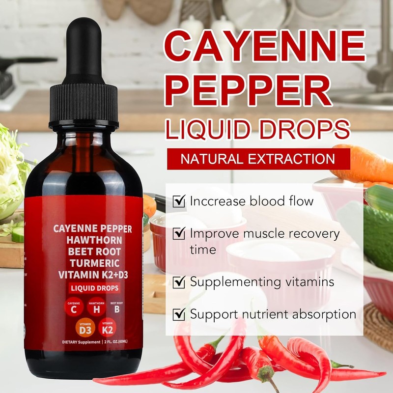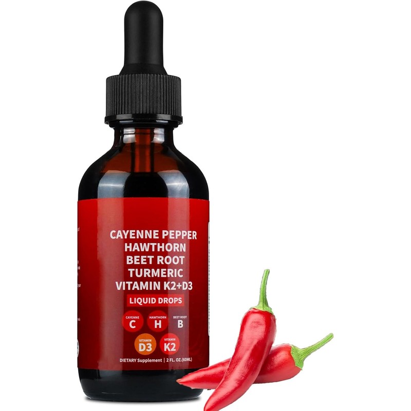 Cayenne Pepper Drops with Hawthorn, Beet Root, Turmeric, Vitamin K2 & D3 – Vegan, Gentle, Fast-Absorbing Liquid Cayenne Supplement – 60ml