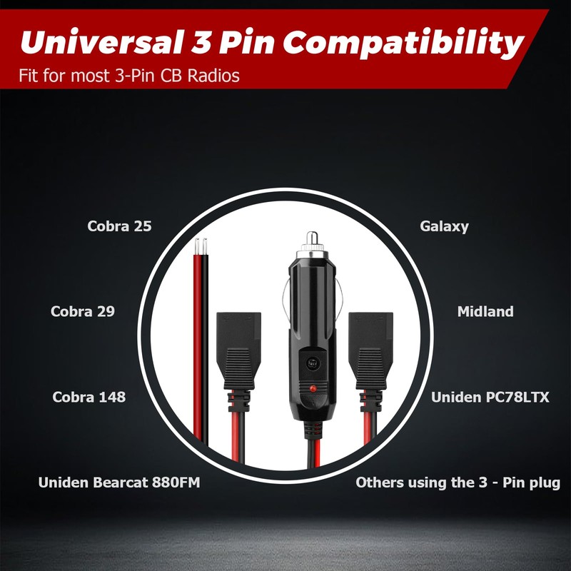 UNIVERSAL 3 PIN COMPATIBILITY: Designed with a standard 3-pin connector, both CB power cables work seamlessly with Cobra, Galaxy, Stryker, Midland, Uniden, Connex, Victrola, and most 3-pin CB radios. No wiring mods needed—just plug in and power up your radio hassle-free, saving CB radio enthusiasts time and installation hassles.