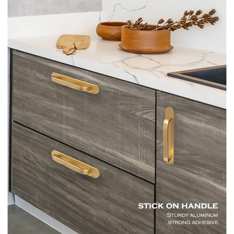 CcHhyyt 2 Pack 5” Self-Stick Handle Aluminum Cabinet Handle Pull with Adhesive Sliding Door Handle Pocket Door Handle Stick On Handle for Fridge Drawer Window Cupboard 2pcs/Set (5", Gold)