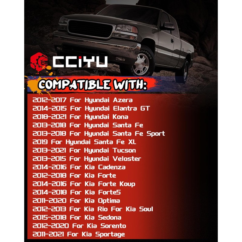 • Compatible with: 2012-2017 For Hyundai Azera, 2014-2015 For Hyundai Elantra GT, 2018-2021 For Hyundai Kona, 2013-2018 For Hyundai Santa Fe & Fe Sport, 2019 For Hyundai Santa Fe XL, 2013-2021 For Hyundai Tucson, 2013-2015 For Hyundai Veloster, 2014-2016 For Kia Cadenza | For Kia Forte Koup, 2012-2018 For Kia Forte, 2014-2018 For Kia Forte5, 2011-2020 For Kia Optima, 2012-2013 For Kia Rio | For Kia Soul, 2015-2018 For Kia Sedona, 2012-2020 For Kia Sorento, 2011-2021 For Kia Sportage