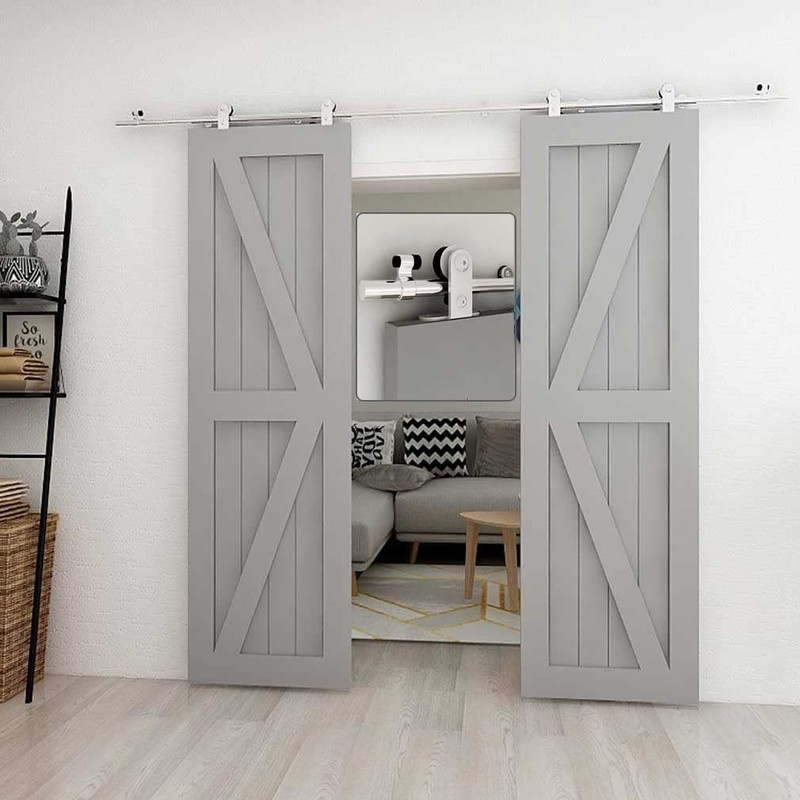 - Packages Included: 1 set double barn door hardware kit stainless steel [1x Spliced 8ft Rail, 4x Roller, 4x Door Stop, 2x Floor Guide; All other necessary hardware is included as you see in the pictures.] Door panel is not included.