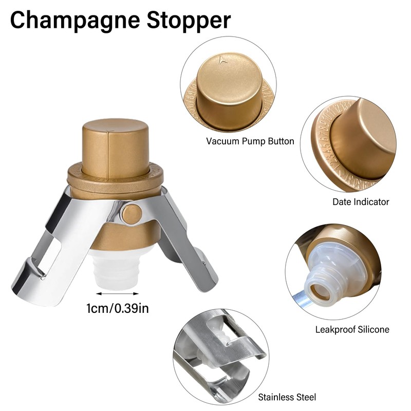 - 【Champagne Bottle Stopper with Pump】 Designed for champagne lovers, the champagne stopper features hinge-mounted flaps that lock onto the bottle's lip. Simply press the button to create an airtight seal, ensuring your bubbly stays fresh longer.