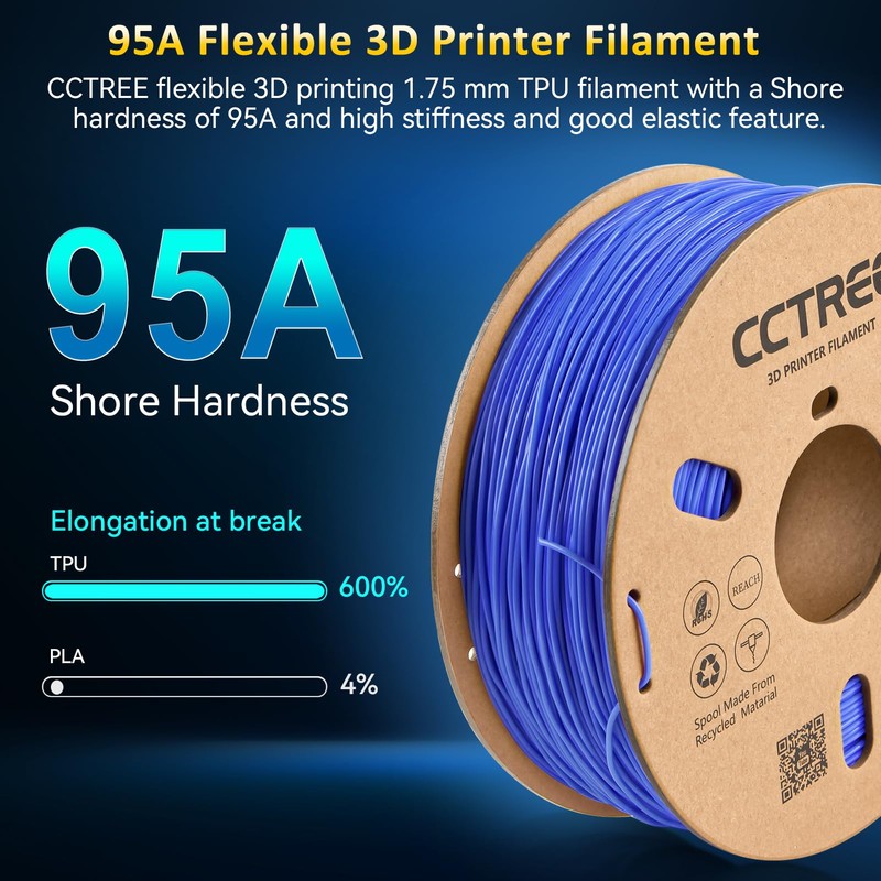 CCTREE TPU Filament 1.75mm, 1kg Spool (2.2 lbs), Flexible 3D Printer Filament, Shore Hardness 95A, High Elasticity & Impact Resistance, Dimensional Accuracy ±0.03mm, Blue