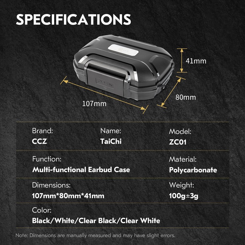 Brand: CCZ Name: TaiChi Model: ZC01 Function: Multi-functional Earbud Case Material: Polycarbonate Color: Black/White/Clear Black/Clear White Dimensions: 107mm*80mm*41mm Weight: 100g±3g Note: Dimensions are manually measured and may have slight errors.