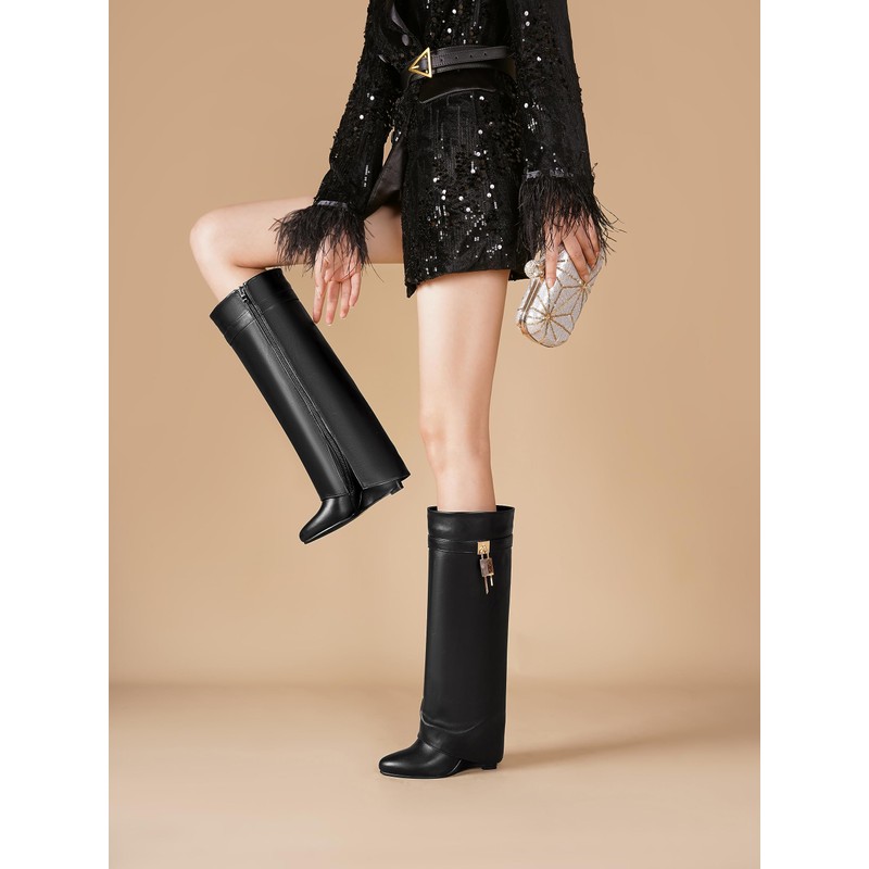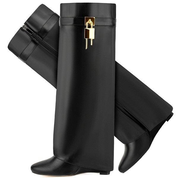 CDHYX Fold Over Boots for Women Pointy Pull-on Wedge Heel Knee Shark Boot With Side Zipper Padlock Design (Black 9)