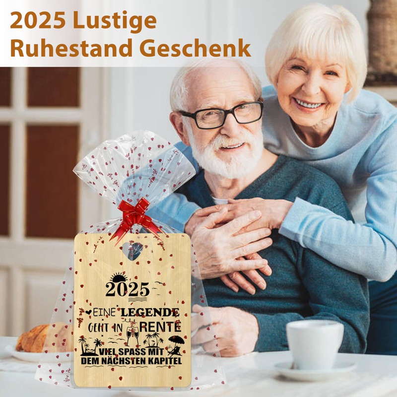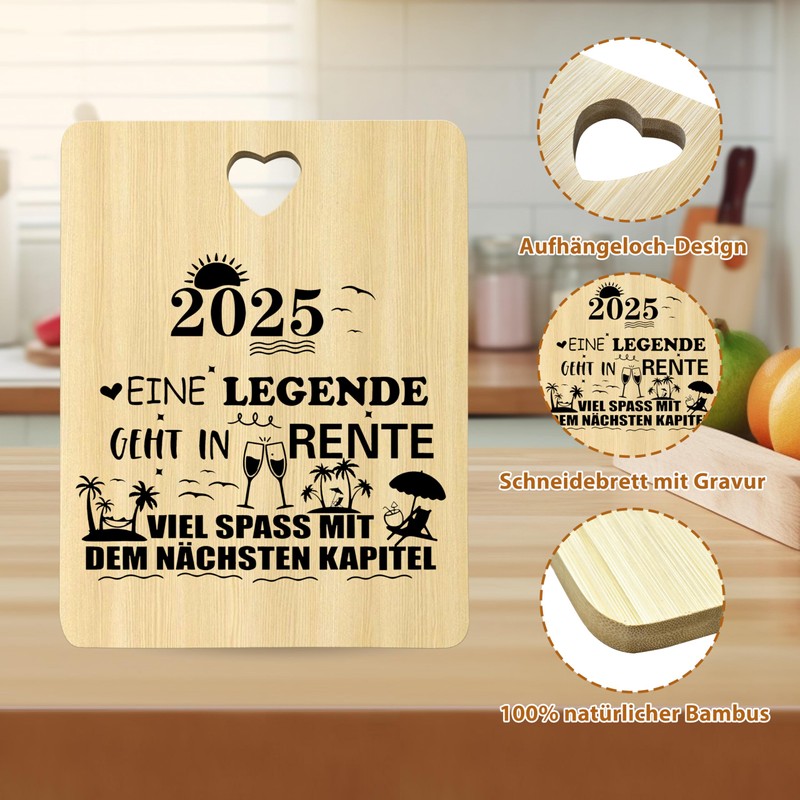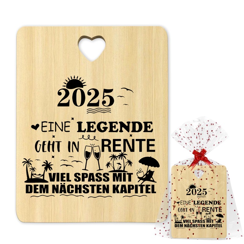 - Retirement gifts for men and women: cutting board with engraving: '2025, EINE LEGENDE GEHT IN RETIRE'. Retirement marks the end of the professional career and the beginning of a new stage of life. This is a suitable gift for men or women for retirement. A classic saying with year makes this special moment unforgettable and particularly meaningful. Such a special retirement gift is guaranteed to delight the pensioner!