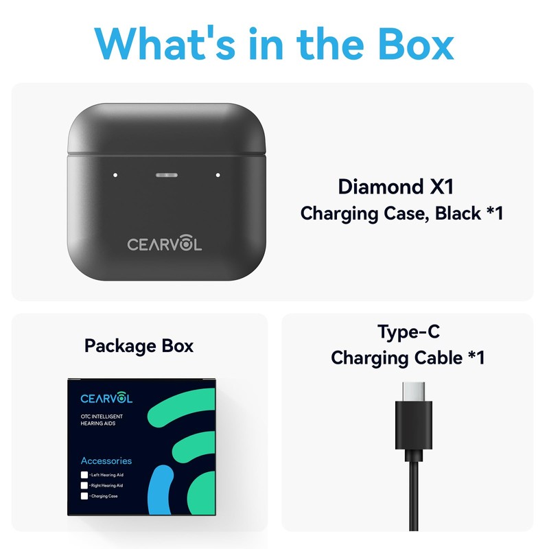 - What's Included & Color Options: Package contains one (1) Cearvol Diamond X1 Replacement Charging Case and one (1) USB Type-C charging cable, securely packaged. Choose your preferred color (Black or White). Hearing aids sold separately