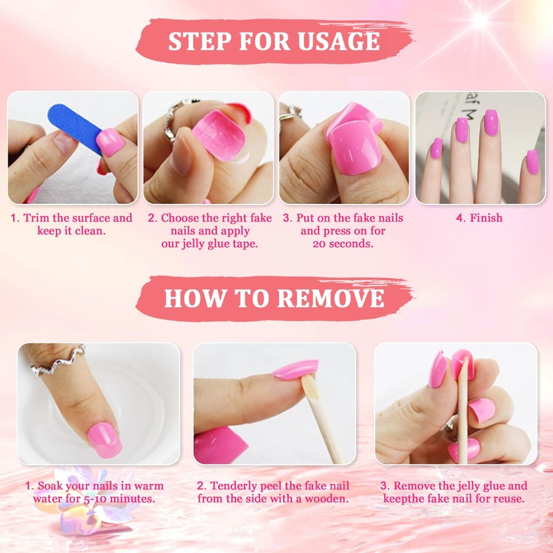 - 🌈【Amazing Convenience】No more costly and time-consuming salon trips, you can get your favorite manicure in just 5 minutes anytime and anywhere. Firstly trim and clean your natural nails, choose the nail piece that suits you, polish the nail bed, paste the jelly glue we give away, and press trendy nails for 15s to get the natural manicure that girls like.