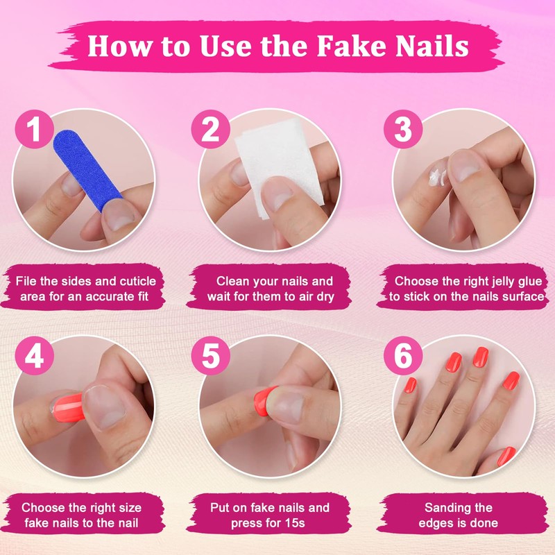 - Easy to use: choose the nail piece that suits you, polish and clean the nails first, stick the jelly glue we give (jelly glue is not as durable as glue, but can be reused) and press the trendy nails for 10-15 seconds to get the natural manicure that girls like.