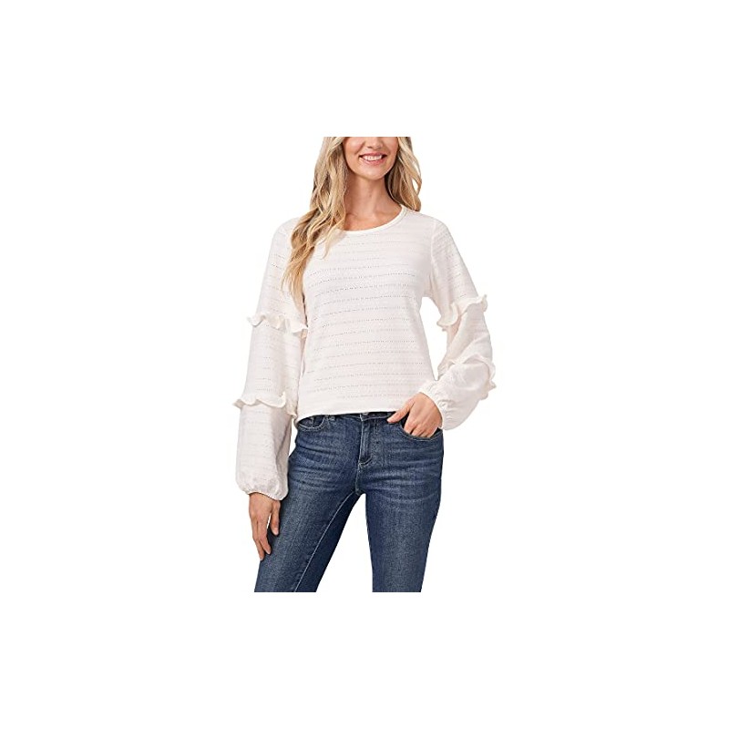 CeCe Long Sleeve Daisy Clip Jacquard Blouse w/Ruffle Detail Soft Ecru LG