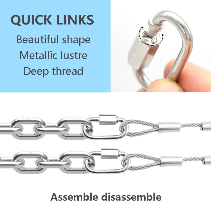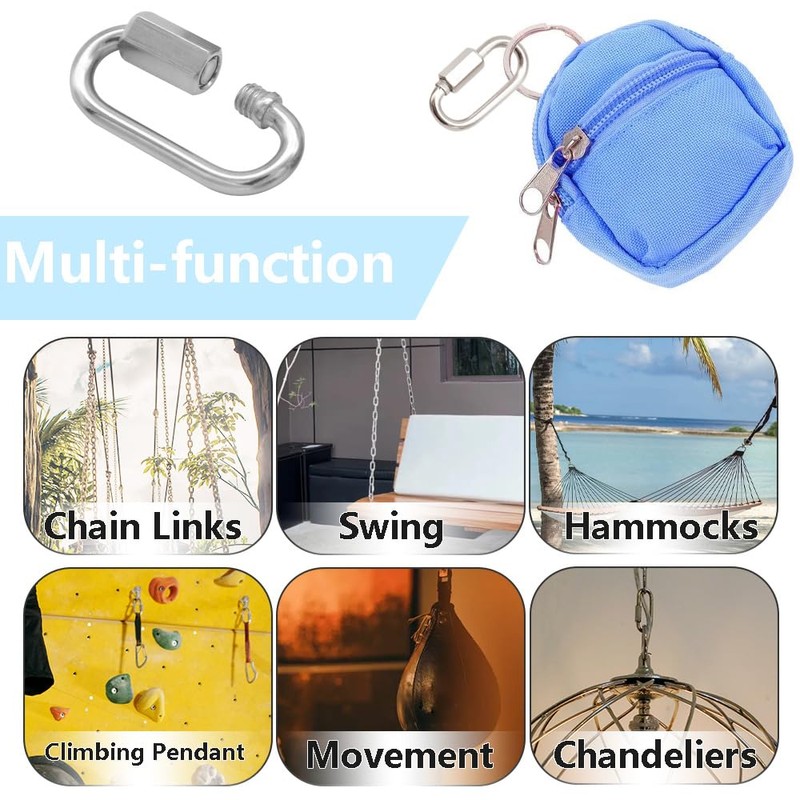 Uses: Stainless steel quick connectors are suitable for chains, ropes, webbing, tents, swings, camping, indoor and outdoor equipment and appliances, and various accessories.