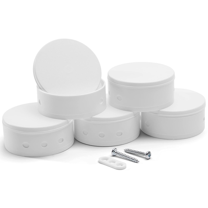 Ceiling canopy/ceiling distribution box/ceiling box quantity: 5 pieces, dimensions: diameter 70 mm, height 30 mm, pre-punched holes for breaking out (cable outlet), colour: white, material: plastic, lid with comfortable twist lock, includes strain relief and mounting set (screws) for covering unused wall or ceiling outlets (power lines) or for making a "monkey swing". Germany