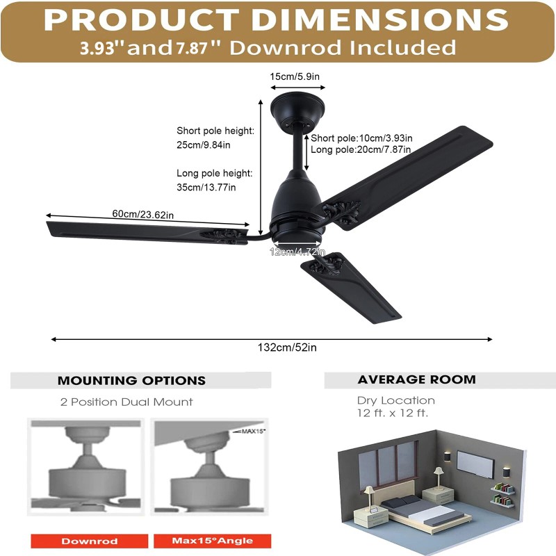 Ceiling Fan - 52 inch Ceiling Fan with Remote Control for Indoor Patio Bedroom