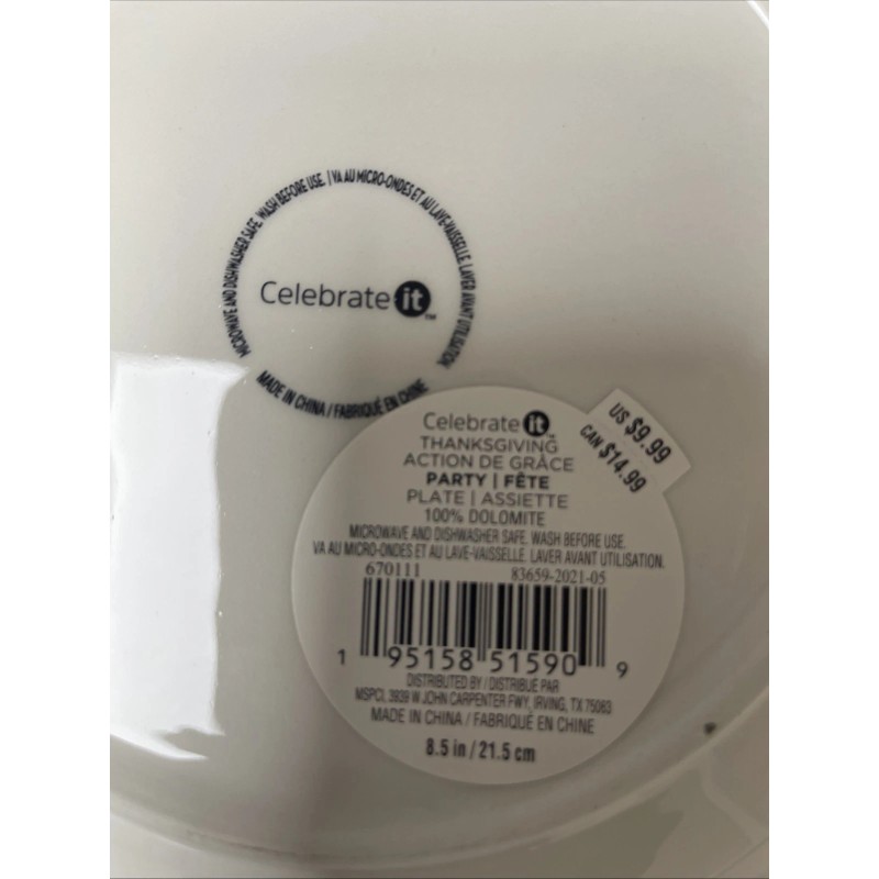 The Celebrate It 8" Salad Plate in a fall-themed design featuring green pumpkin, perfect for Thanksgiving and harvest celebrations. Made of durable stoneware with a glossy finish, this decorative plate adds a festive touch to your table setting. The multicolor pattern and printed backstamp make it a standout piece for your holiday gathering or any occasion. Imported from China, this salad plate brings a touch of charm and style to your dining experience.