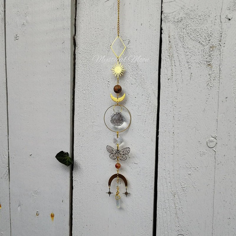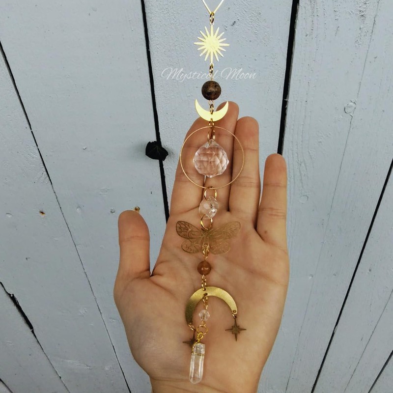 Celestial Moth, Moon & Stars Suncatcher Hanging Home Decor Window Wall Decor Rainbow Casting Crystal Prisms Leopard Jasper and Clear Quartz Gemstones Fairy Witchy Decor