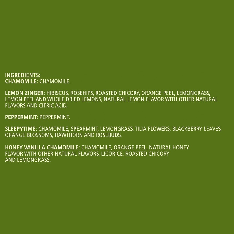 • Contains Chamomile, Lemon Zinger, Peppermint, Honey Vanilla Chamomile & Sleepytime