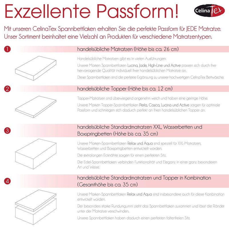 - Discover the wide range of colours and sizes of our fitted sheet, suitable for mattresses with a height of up to approx. 26 cm or for toppers with a height of up to approx. 12 cm