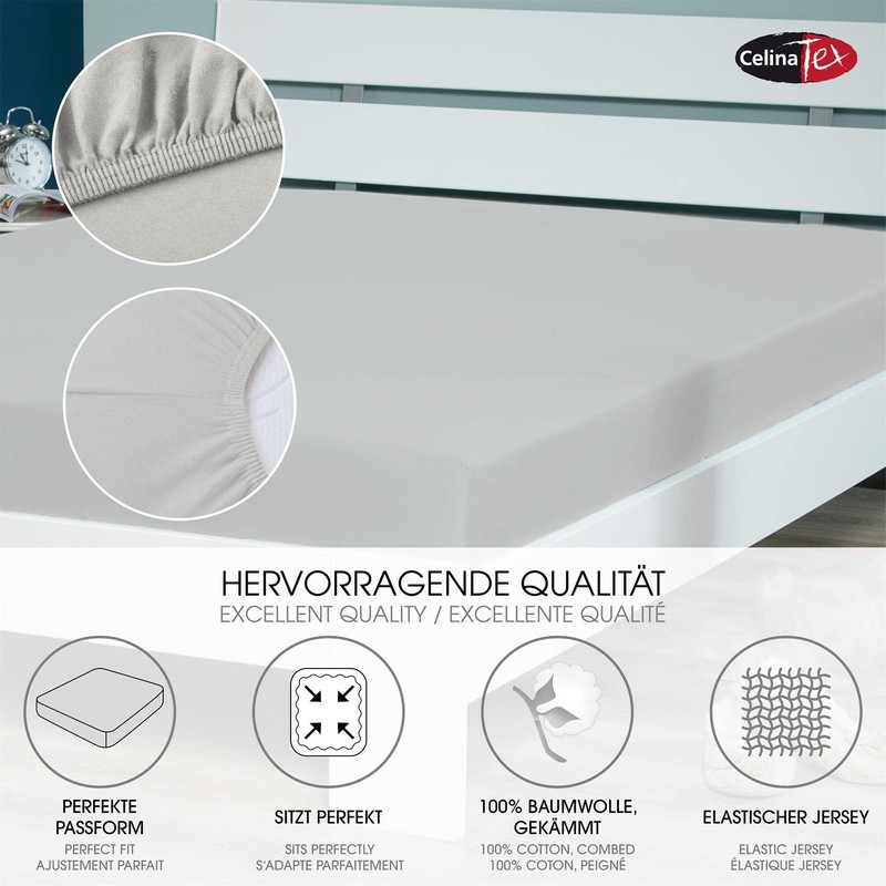 - Branded bed sheet, 100% combed cotton, jersey, weight of approx. 130 g/m². With the Öko-Tex Standard 100 certification. The high elasticity of the jersey fabric also provides for a perfect fit.