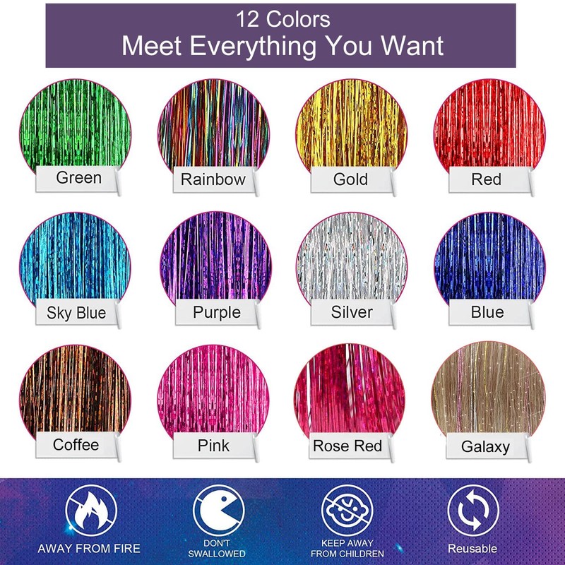 Package:Hair Tinsel 12Pcs(80 Strands/Pcs,24Inch In Length.)Color:Gold,Silver,Lake Blue,Sapphire Blue,Green,Red,Light Pink,Deep Purple,Rose,Coffee,Galaxy,Rainbow.1Pcs/Color