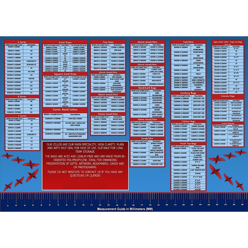- OUR RANGE: Celloexpress Cello Bags are available in a large range of sizes. Please check the exact millimetre size of your items, including any envelopes or mounts so that the correct size bag is purchased. Contact us if you need any assistance to choose the size you require