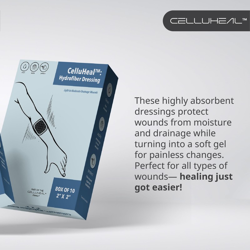 CelluHeal™ Hydrofiber Wound Dressing 2x2 – Gel-Forming for Faster Healing, Sterile, Protects Tissue from Excess Moisture, Ideal for Pressure Ulcers, Diabetic Wounds, Burns, Surgical Wounds – 10 Pack